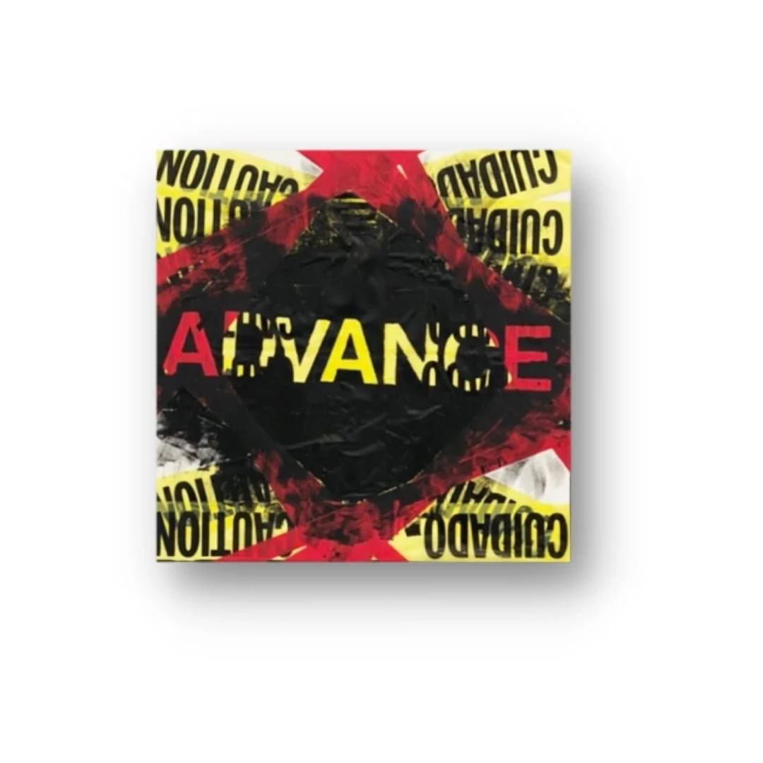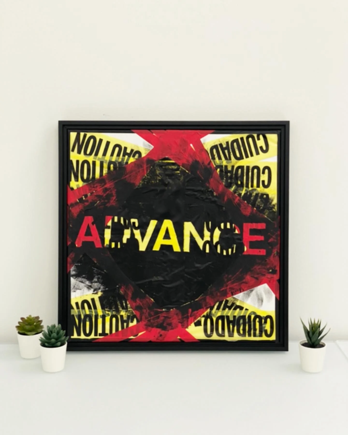 ADVANCE.20”X20". Caution tape, tape, acrylic paint on stretched & primed canvas.To inquire more, contact Koops.