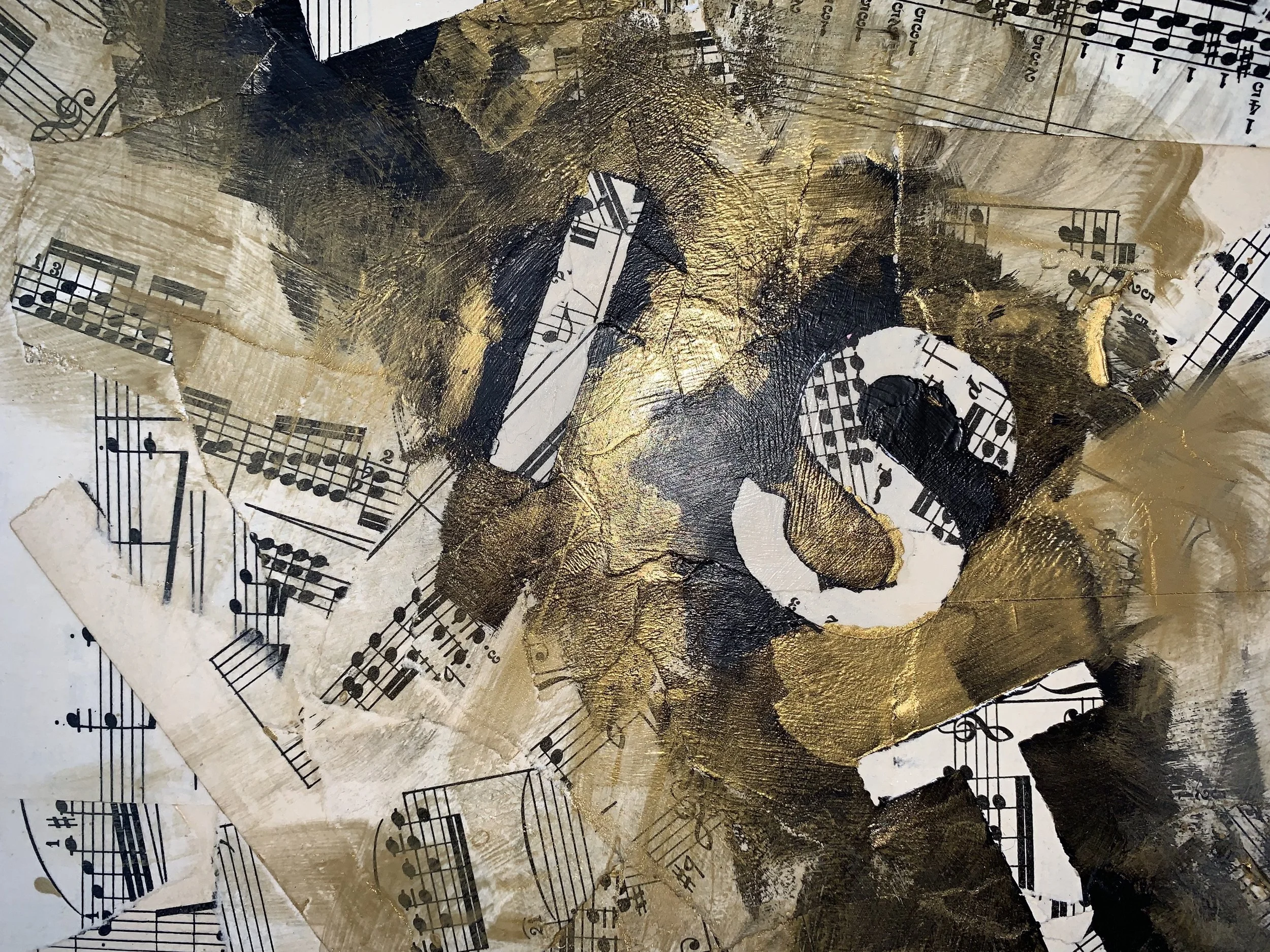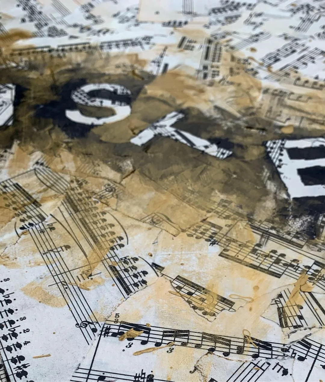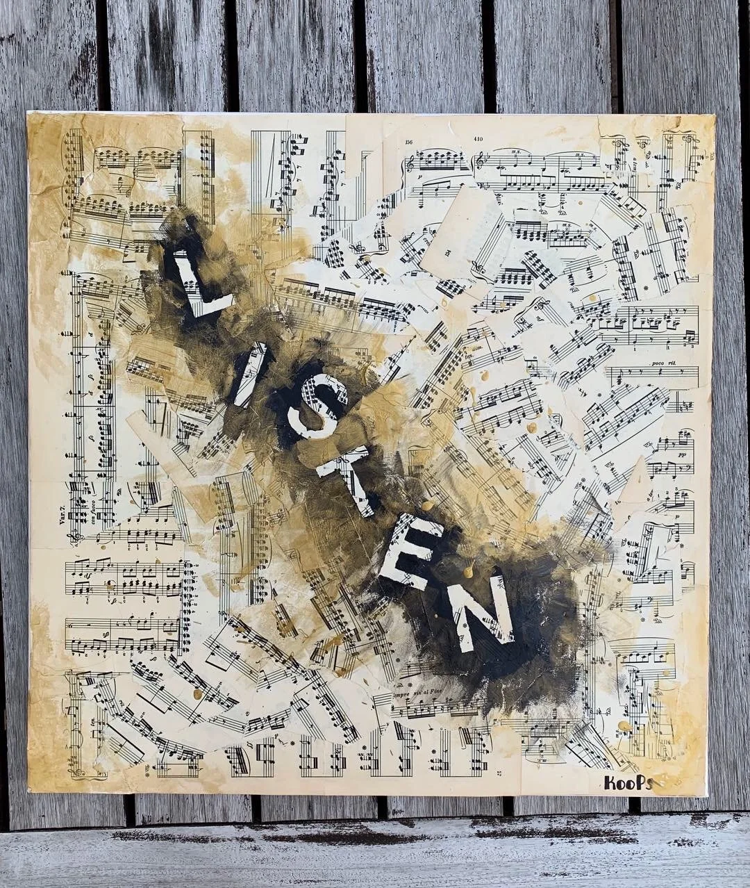 LISTEN.20”X20". Shredded music sheet, acrylic paint on stretched & primed canvas.To inquire more, contact Koops.