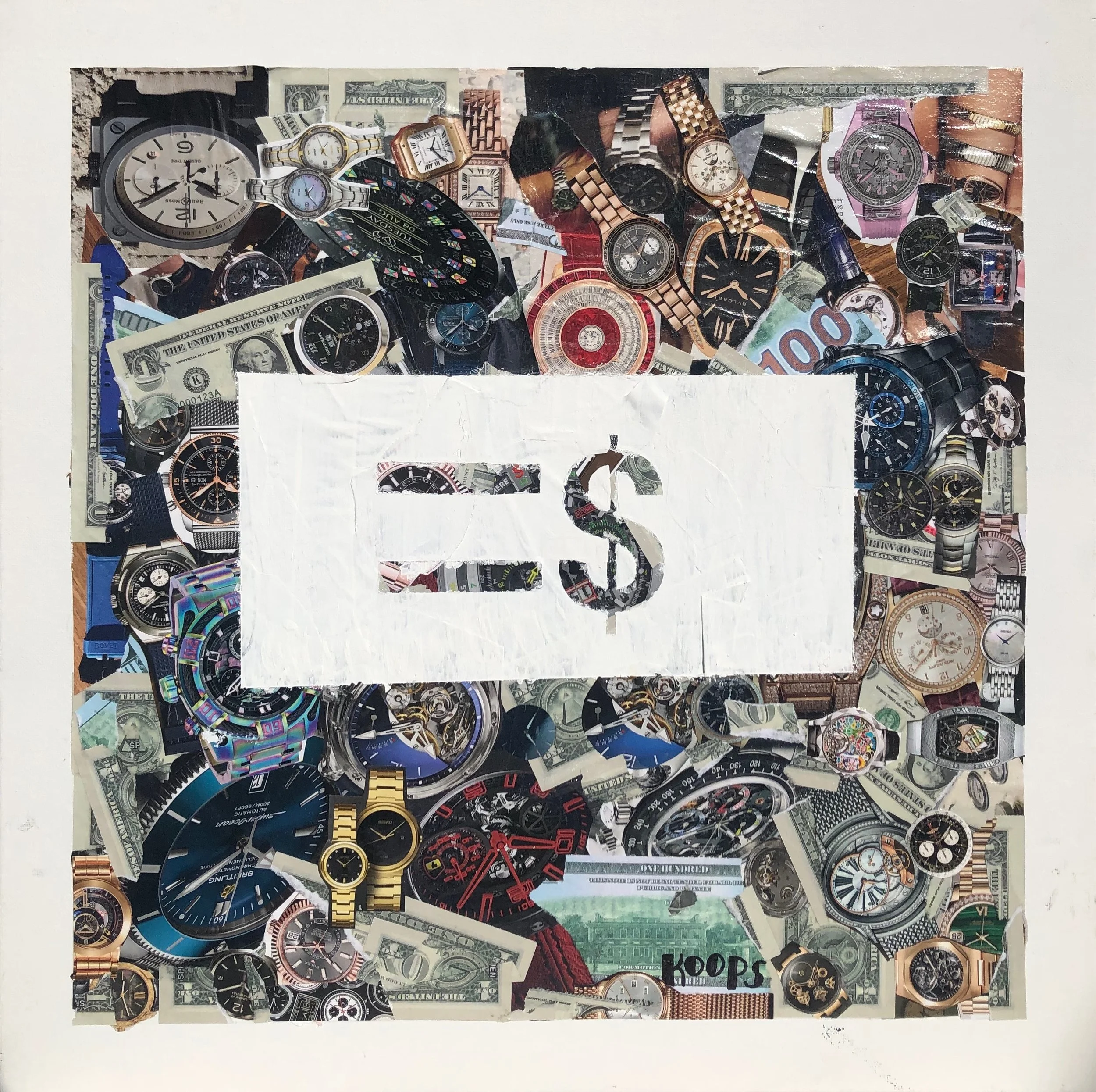 TIME I$ MONEY.20”X20". Magazine clippings, acrylic paint on stretched & primed canvas.To inquire more, contact Koops.
